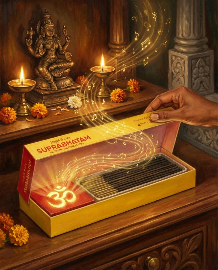 For the last 125 years incense sticks offerings have seen no real innovation. For the first time Ambica Arogya proudly introduces RagahSvara – A new experience for Consumers – an Agarbathi that does not merely burn but performs a divine morning concert!